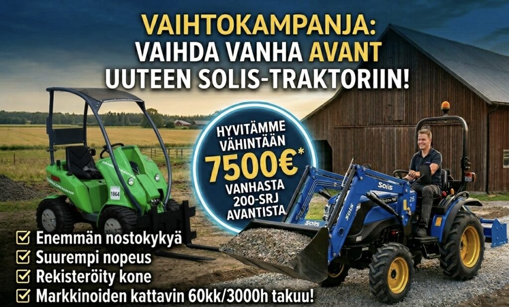 Tuomme maahan Solis traktorit ja Thaler pienkuormaajat ja toimimme kyseisille tuotemerkeille maahantuojan huoltopisteenä. Palvelemme niin yksityisiä kuin ammattiasiakkaita koko Suomessa. Tarjoamme laajat rahoitusvaihtoehdot hankinnoillesi. Ylläpidämme myös laajaa yli 300000 tuotenimikkeen varaosavarastoa. Verkkokaupan kassalta voit ostaa jopa 10 000 € hankinnat osamaksulla. Myös yrityslasku suoraan kassalta. Suurempiin hankitoihin voit hakea rahoitusta asiakaspalvelumme kautta.
